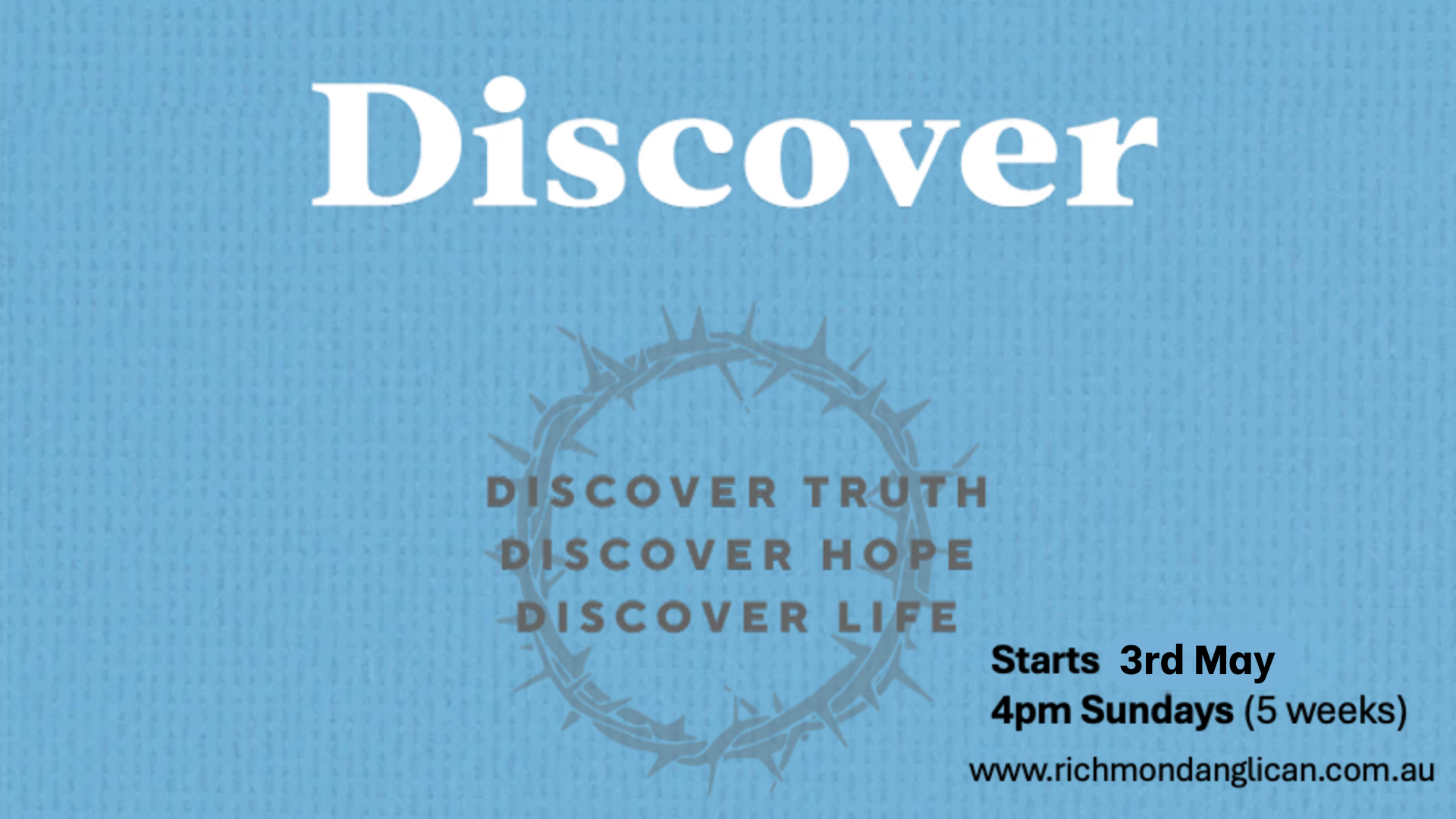 Starts 3rd May, 4pm in the Church Education Centre.